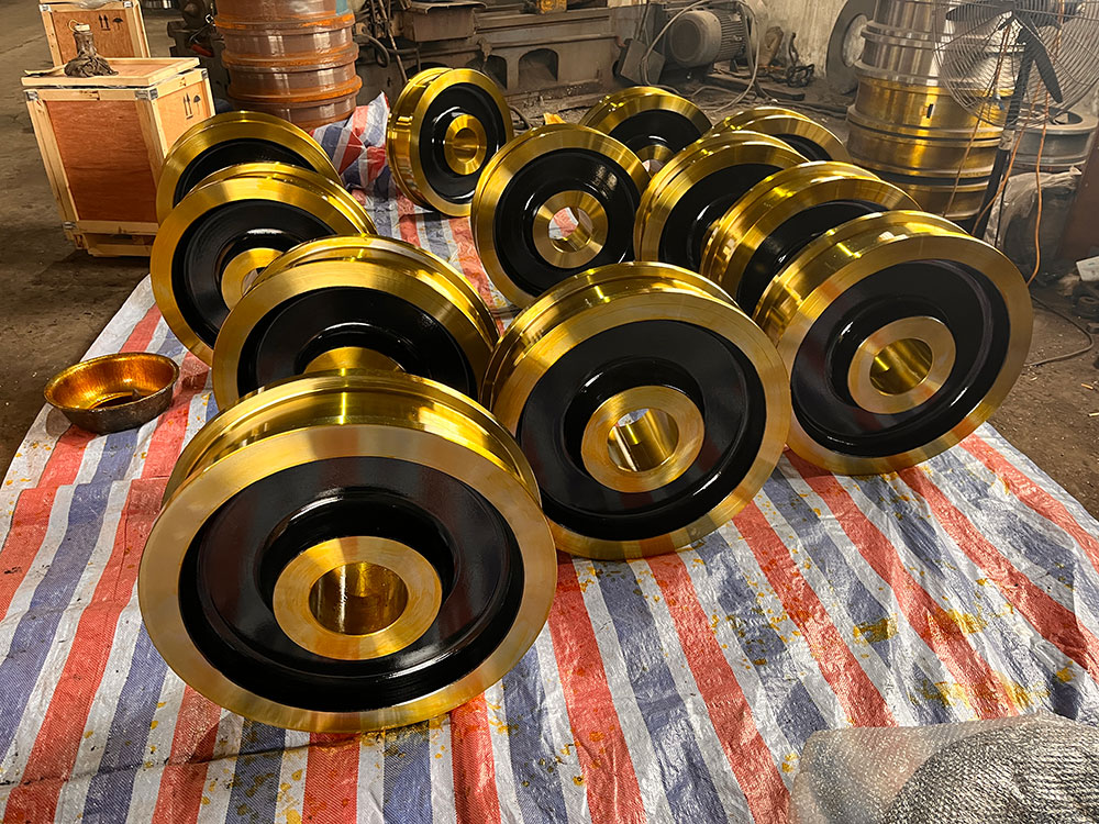 車輪組是指車輪與軸、軸承和軸承箱等組成的機(jī)械設(shè)備。車輪是用來支承起重機(jī)和載荷,并在軌道上使起重機(jī)往復(fù)行駛運(yùn)行的裝置。車輪主要損傷的形式是磨損、硬化層壓碎和點(diǎn)蝕。車輪的材料一般采用ZG430-640鑄鋼。為了提高車輪表面的耐磨強(qiáng)度和壽命,踏面應(yīng)進(jìn)行表面熱處理,要求表面硬度為HB300-350,淬火深度不少于20mm?! ≤囕喗M用途  起重機(jī)車輪組:起重機(jī)運(yùn)行機(jī)構(gòu)車輪的水平偏斜值是起重機(jī)重要的技術(shù)參數(shù),偏斜值超差會(huì)造成啃軌,增大運(yùn)行阻力,產(chǎn)生振動(dòng)和噪音,加劇軌道和車輪磨損,大大降低起重機(jī)使用壽命,所以各類起重機(jī)制造技術(shù)條件都要對(duì)車輪水平偏斜規(guī)定允許的數(shù)值?! ≤囕喗M結(jié)構(gòu)  應(yīng)用中控制運(yùn)行機(jī)構(gòu)車輪水平偏斜值主要是根據(jù)不同的產(chǎn)品結(jié)構(gòu)采取相應(yīng)的技術(shù)措施。比較常用、工藝措施也相對(duì)簡單的設(shè)計(jì)結(jié)構(gòu)是:將車輪裝配到支架上組成車輪組,例如角型軸承箱車輪組和臺(tái)車式45°剖分軸承箱車輪組,在起重機(jī)主結(jié)構(gòu)上,安裝調(diào)整車輪水平偏斜合適后固定。