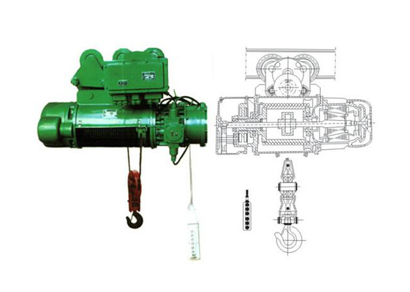 電動葫蘆結(jié)構(gòu)緊湊,電機軸線垂直于卷筒軸線的電動葫蘆采用蝸輪傳動裝置。其缺點為:長度尺寸大,寬度方面尺寸大,結(jié)構(gòu)粗笨,機械效率低,加工較難等。液壓系統(tǒng)為雙重控制,溢流調(diào)節(jié)閥、磁接點壓力表均可對壓力進行精確的控制。電器控制部門采用了低電壓控制,增加了支配系統(tǒng)的安全性。